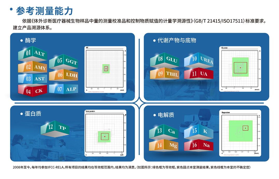 MK(中国)一站式服务官网医学参考实验室致力于公司产品溯源体系的建立和维护,主要承担建立量值溯源及参考方法,参加国内外权威机构组织的能力验证,完成企业校准品的研制、赋值、监测及管理的相关工作,为公司产品质量保驾护航。发展历程:2006年,正式组建2008年,首次通过IFCC-RELA酶学项目2009年,首次通过IFCC-RELA代谢产物与底物项目2010年,首次通过IFCC-RELA蛋白质项目2011年,首次通过IFCC-RELA离子类项目(我国首家将原子吸收平台应用于离子参考测量的实验室);起草行业标准YY/T 1195-2011《血清总蛋白参考测量程序》(我国首个生化诊断领域参考方法行业标准)2014年,依据ISO/IEC ISO17025和ISO15195建立实验室质量管理体系2015年,完成北京市专项课题《医疗器械(体外诊断试剂)检测与参考品评价服务平台》(与中国食品药品检定研究院合作)2018年,获得CNAS认可2019年,完成北京市科技计划课题《G20工程龙头企业培育——生化诊断试剂质量性能评价研究及标准品体系建立》(与卫生部临检中心、北京市医疗器械检验所等单位合作)2021年,进入JCTLM参考测量服务实验室数据库2022年,CNAS扩项评审通过,我司医学参考实验室获CNAS认可的项目共计12项