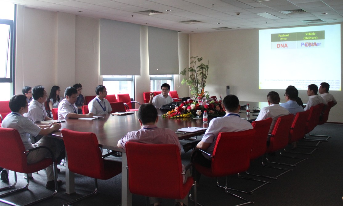 报告会上,罗丹教授向大家介绍新型DNA材料制作原理,并结合实际应用介绍了DNA材料与微流控技术结合后,在快速检验方面的应用。随后讲解了制作DNA水凝胶的方法,以及DNA凝胶在无细胞蛋白表达方面的应用。最后,罗丹教授向大家介绍了DNA超胶的奇特性质及其制作原理。报告中,罗丹教授与在座的研发中心技术骨干进行了热烈的讨论和交流。报告结束后罗丹教授参观了公司研发中心。